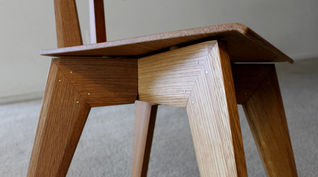 A pack flat chair out of rift oak and oak ply. Frame is made out of four elements interconnected with each other through 3 lap joints. Miter joints are reinforced with sliding tenons, which are pinned with brass pins. It makes for a rather heavy but near indestructible frame. I made my own 3/8" ply for the seat and back - it is elastic and offset from the seat on rubber spacers which makes for a really comfortable seat.